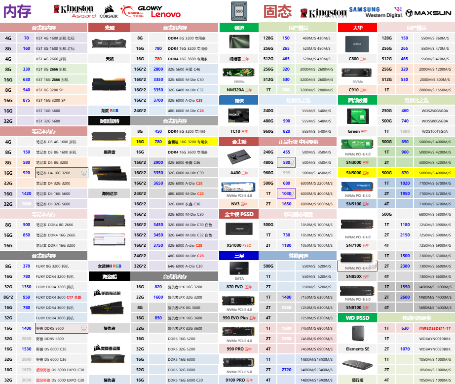 (以下价格为当天实时拿货价,仅当天有效,可提供一条龙装机服务)2026年最新电脑三大件渠道批发报价单(Intel、AMD、金士顿、海盗船、芝奇、希捷、西数、七彩虹、金百达内存固态等)