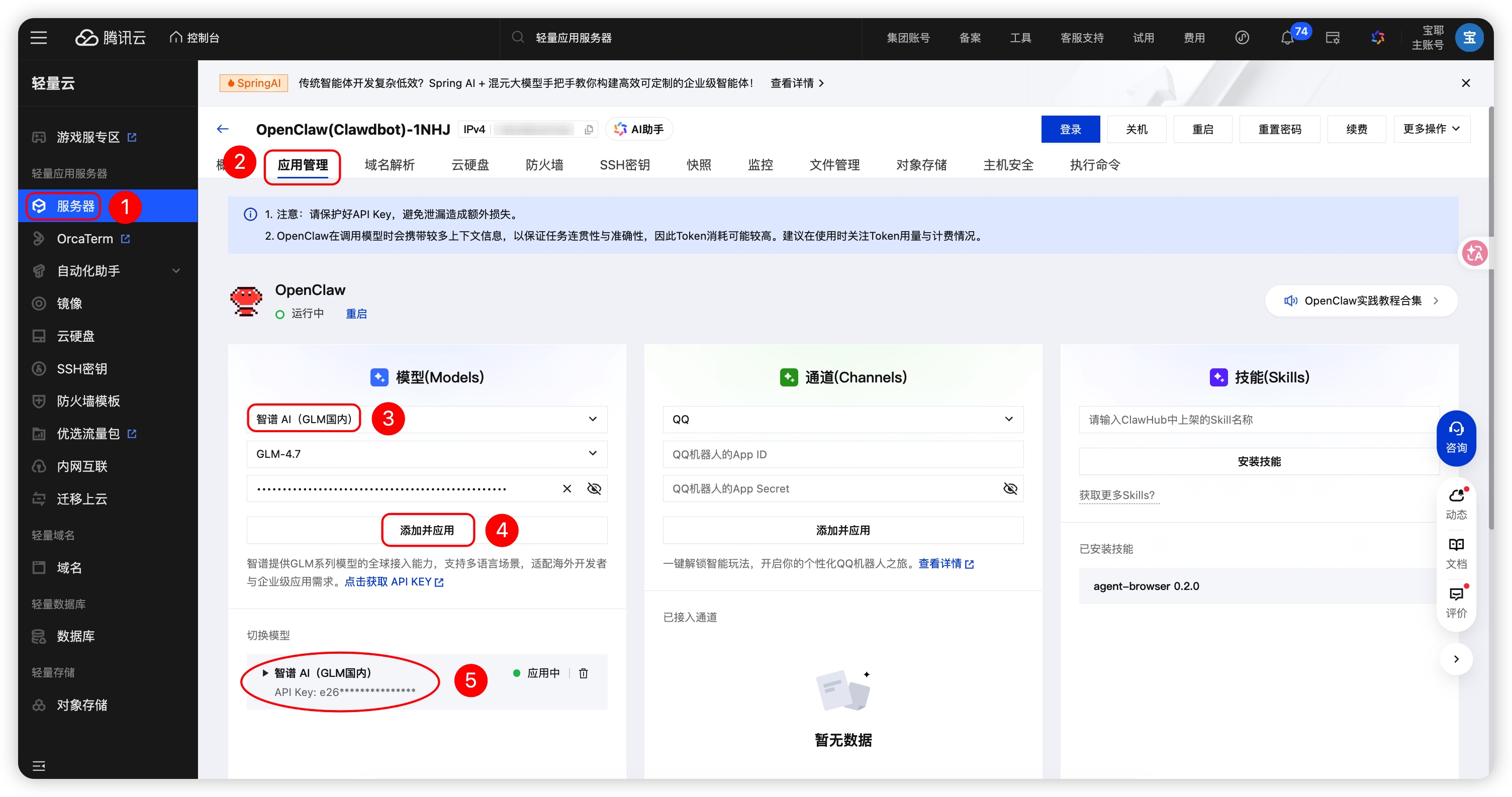 在轻量应用服务器实例详情页-应用管理页内的OpenClaw配置面板中,添加企业微信应用通道。