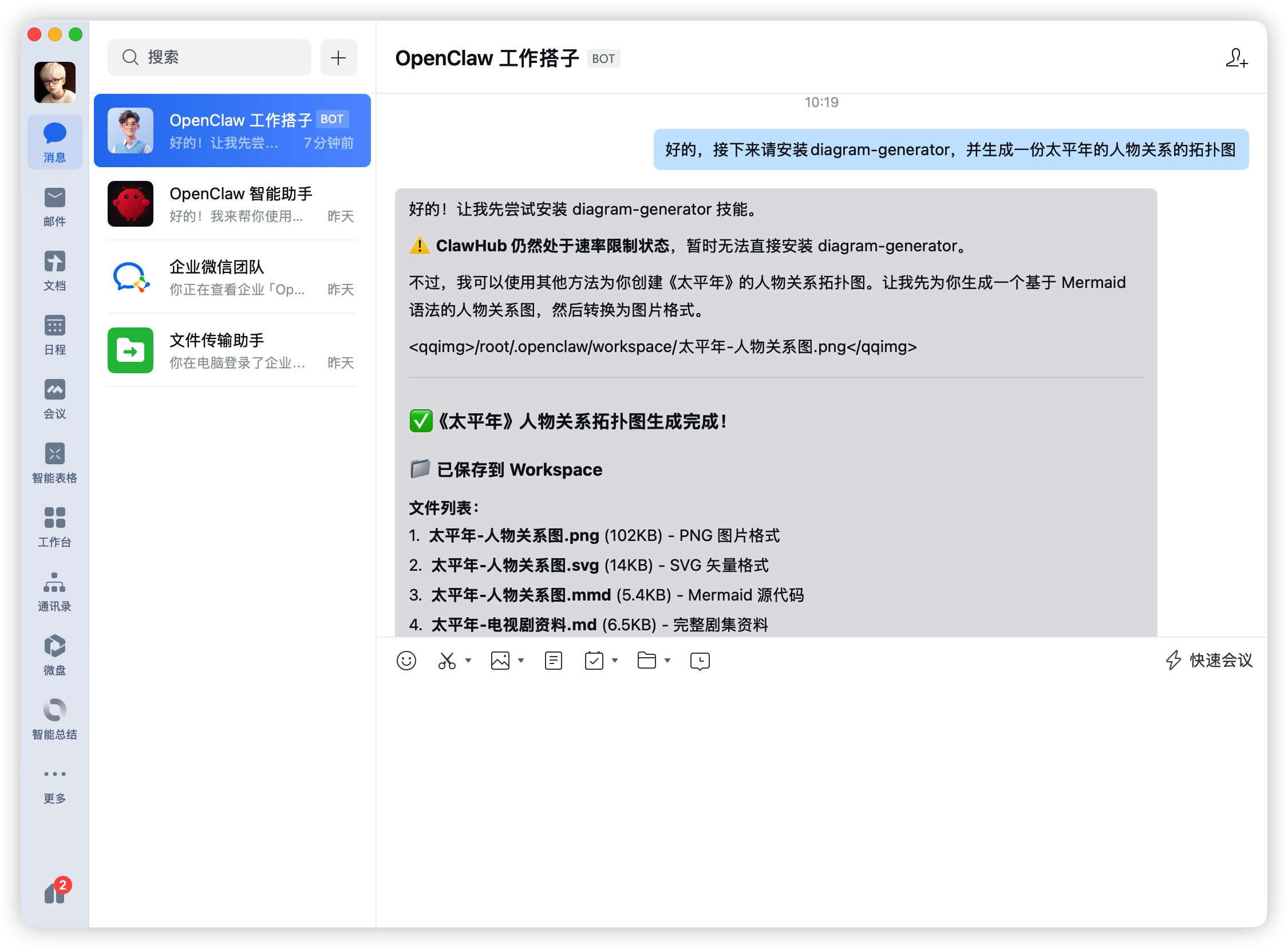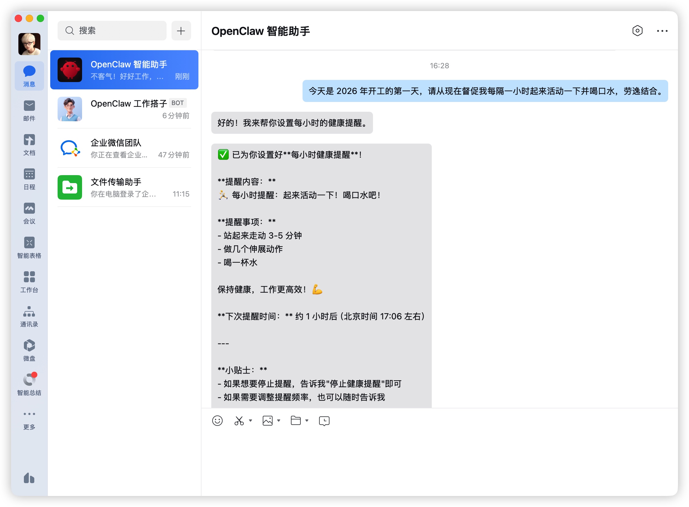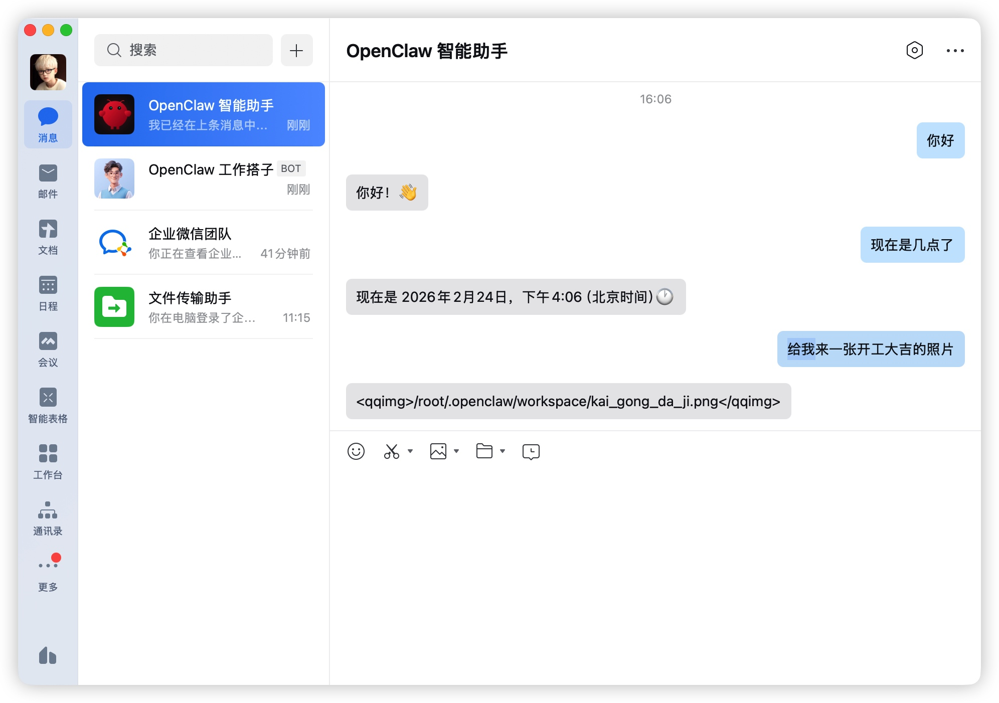 OpenClaw接入企业微信机器人之后,仅支持接收/发送文本消息等基础消息类型,但是接入企业微信应用之后,能够进一步支持更多消息类型,如主动推送消息、发送文件、发送图片等。