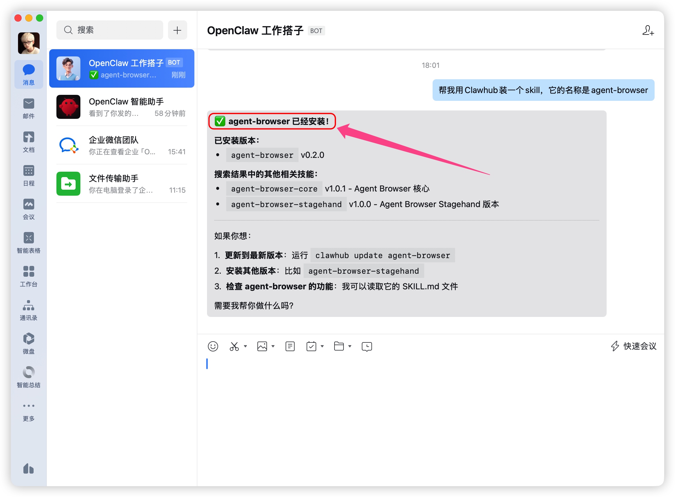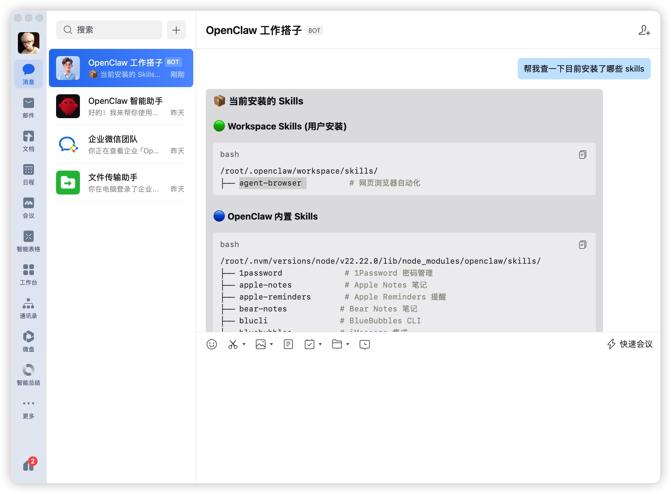 OpenClaw 的强大在于其无限的可扩展性。查看已安装技能:通过输入指令,你可以随时查询当前系统已加载的 Skills 列表。动态扩展:你可以根据需求随时安装来自社区或自己编写的插件,如文件处理、搜索增强等工具。