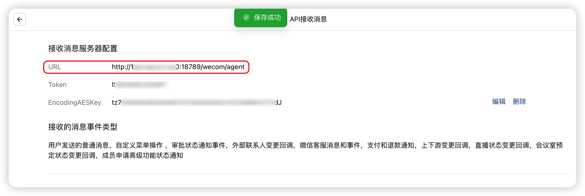 注意:URL需要使用http而非https,并使用英文冒号,并且加上端口号(默认为18789)和 /wecom/agent 。