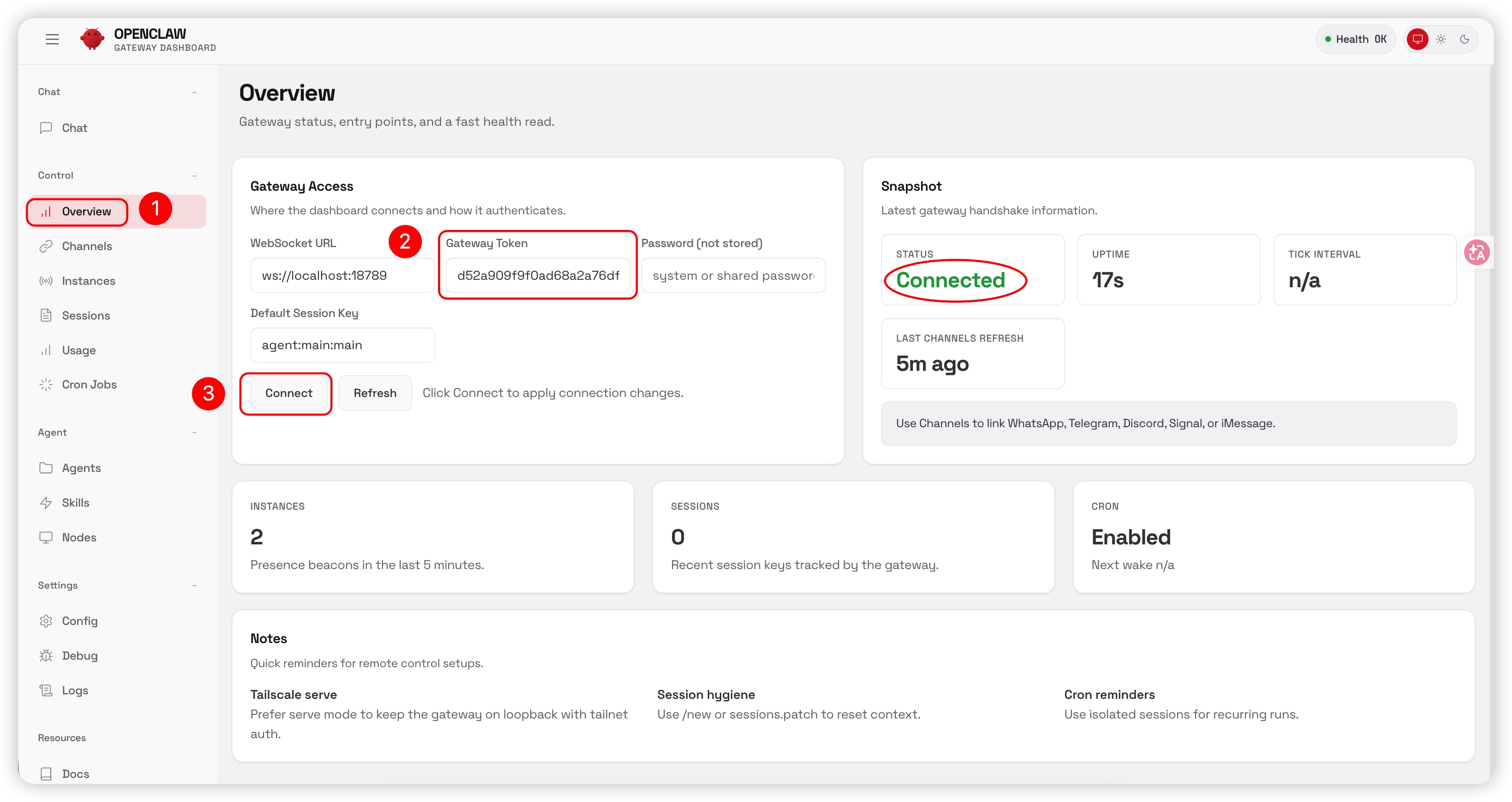 登录面板:打开浏览器访问 http://127.0.0.1:18789,在 Overview 页面输入获取的 Token 即可进入。