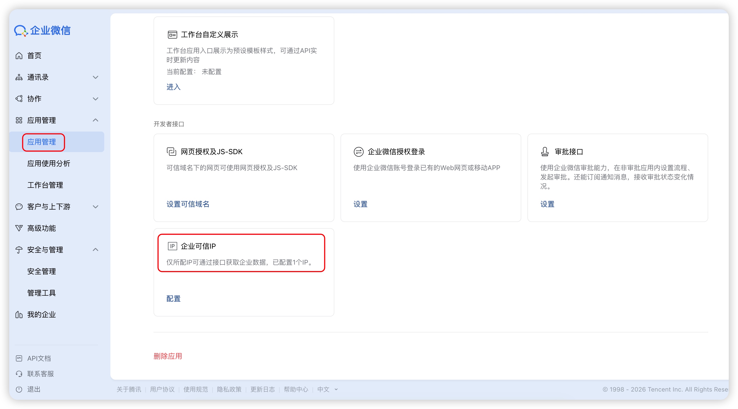 配置企业可信IP,将企业微信应用能够接收到来自部署的OpenClaw回复的信息。